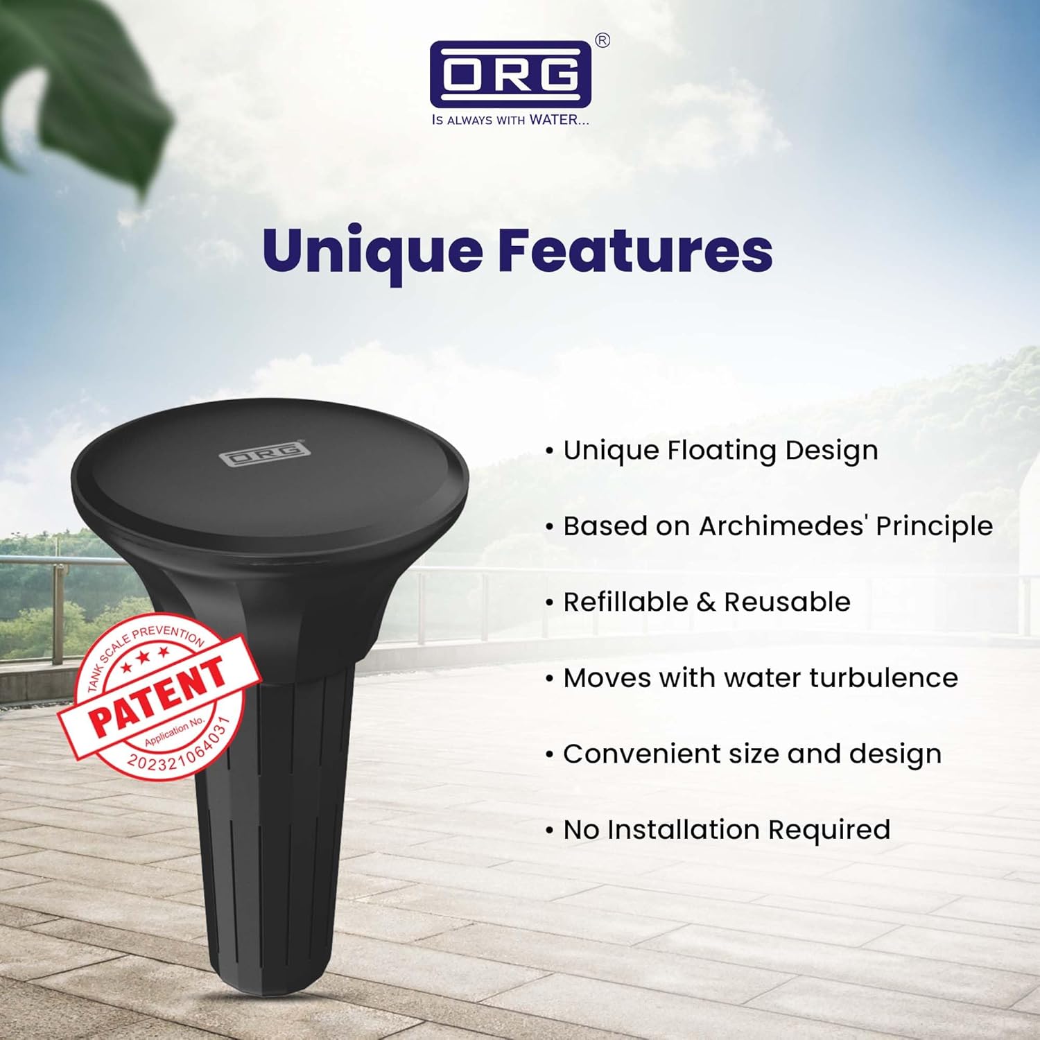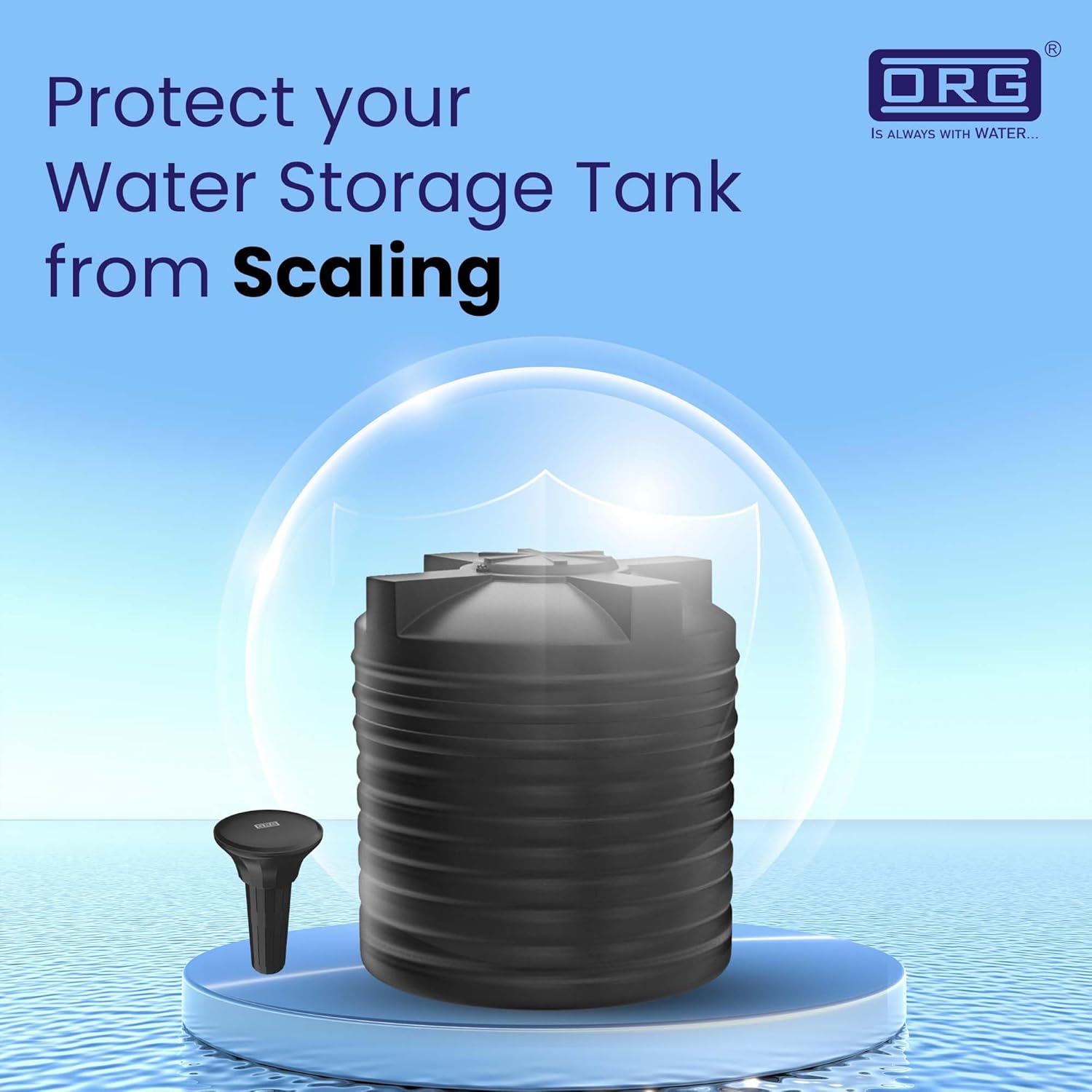 NOW YOUR TANK SOLVES HARD WATER PROBLEMS WITH SCALEFREE TANK!" ScaleFree Tank is designed to protect water storage tanks from scaling, particularly in homes that store water for daily use. This floating device offers an affordable solution for areas with limited budgets or space for traditional softeners. As the ScaleFree Tank floats in the water, polyphosphate is gradually released, preventing scaling on tank walls, plumbing and all appliances in contact with water.