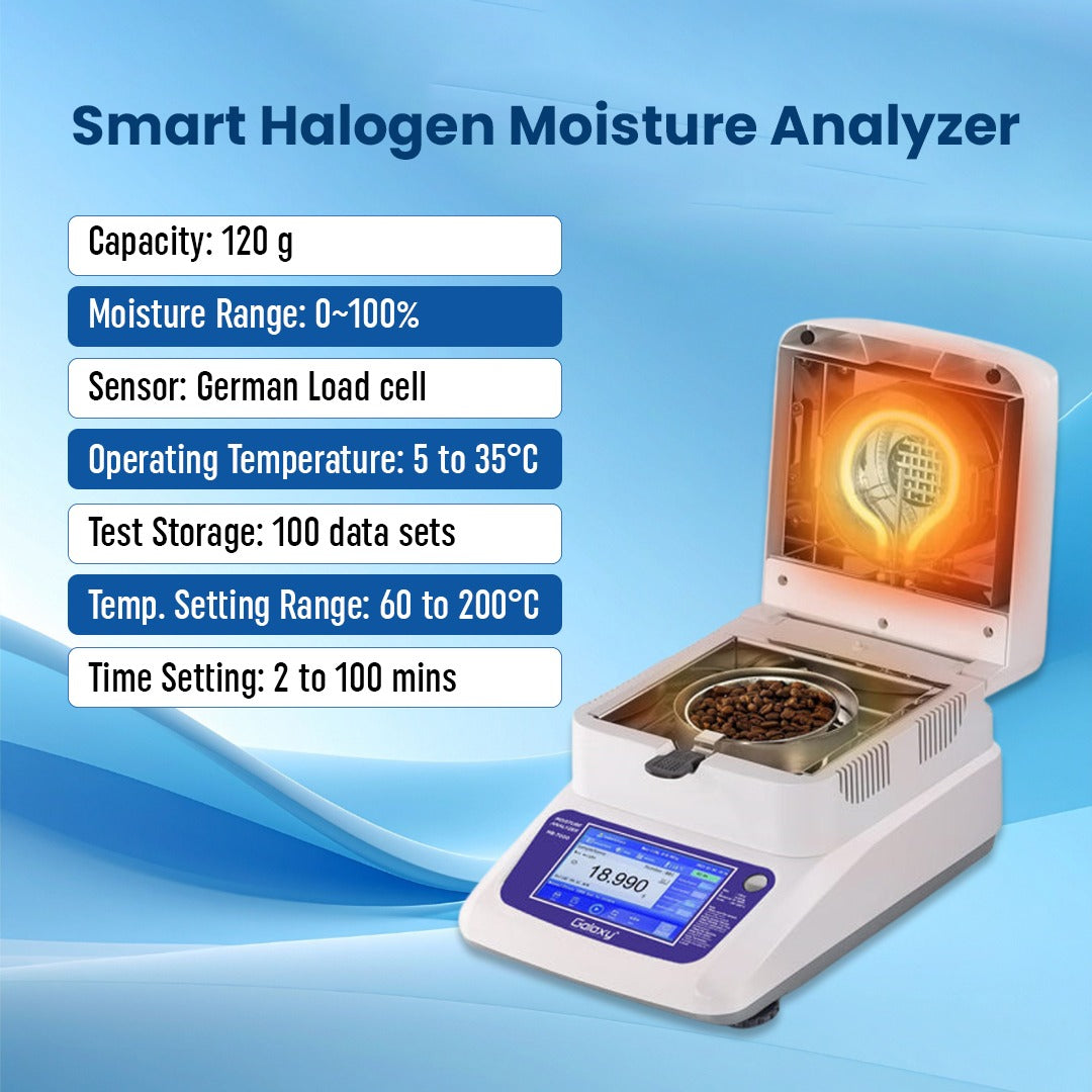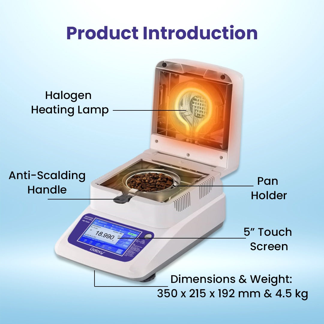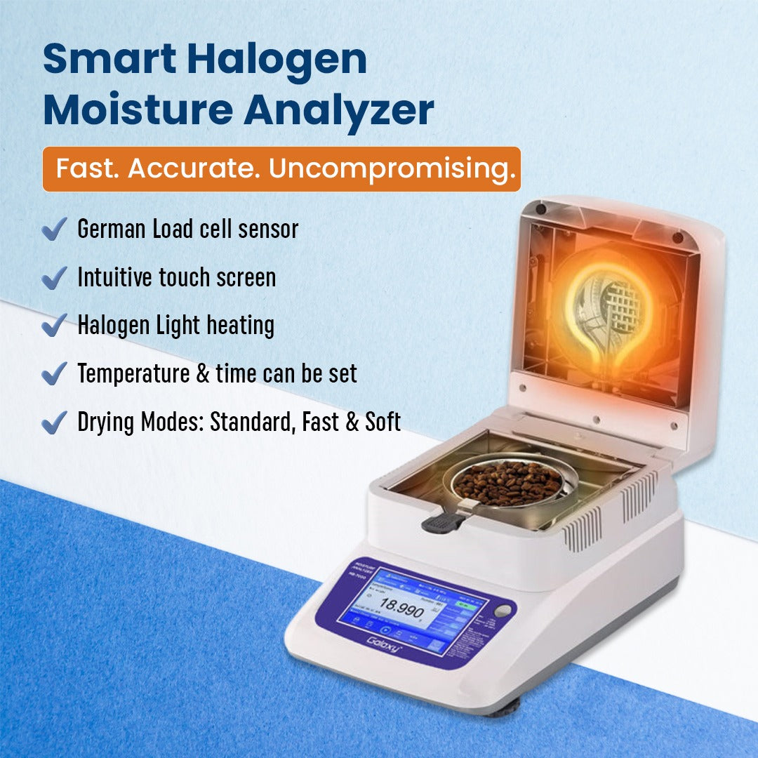 The Galaxy MB-7000 Halogen Moisture Analyzer is a smart, high-precision moisture analyzer designed to meet the needs of quality control, R&D, and production environments. With advanced features, German sensor technology, and an intuitive interface, it ensures accurate and reliable moisture content determination across a wide range of sample types.